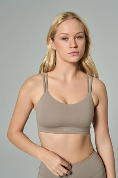 NALA Activewear brown cross-back sports bra and capri leggings set back view; kahverengi çapraz askılı spor sütyen ve diz altı tayt giyen kadın model gri fonda arkadan görünüyor.